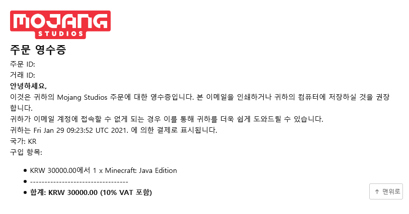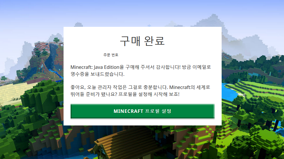 7. 이렇게 구매가 완료되면 구매 완료가 표시되면서 영수증이 메일로 전송됩니다. MINECRAFT 프로필 설정을 누릅니다.