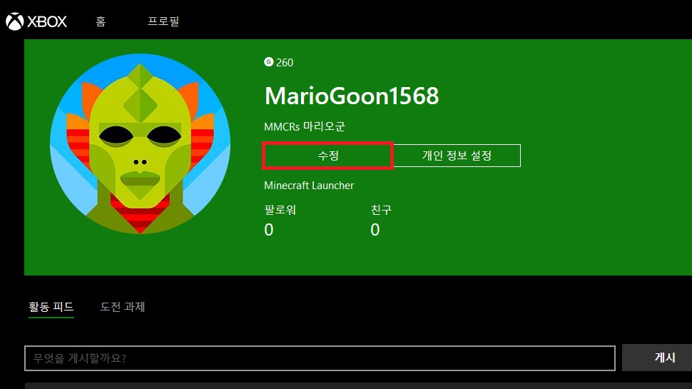 * 마인크래프트: 자바 에디션은 Xbox의 게이머태그와 달리 닉네임을 따로 설정할 수 있습니다.