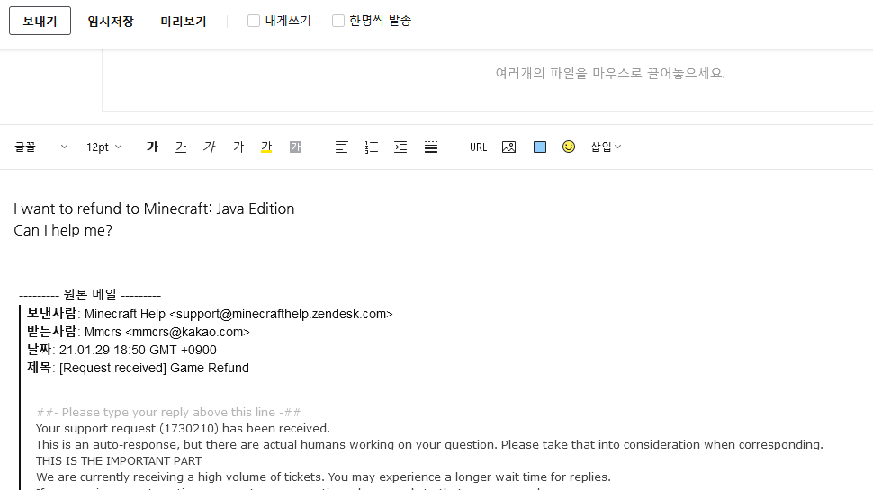 12. 제출하면 자신이 마인크래프트를 구매했던 메일에 환불 확인 메일이 날라옵니다. 답장을 눌러 맨 윗줄에 한 번 더 문의사항을 입력하여 보냅니다.