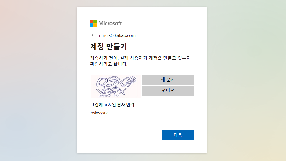6. 그림에 표시된 문자를 입력하고 다음을 누르면 계정 만들기가 완료됩니다.