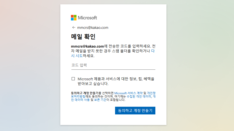 5. 가입할 이메일에서 전송된 코드를 복사하여 코드 입력란에 붙여넣고 동의하고 계정 만들기를 누릅니다.