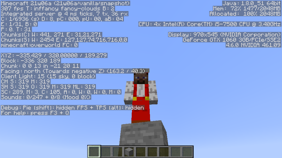 이제 오버월드의 높이 제한이 지상 64블록(최고 y=320), 지하 64블록(최저 y=-64)씩 총 384블록으로 확장되었습니다. 이로 인해 지하 구조물과 동굴은 -64까지 생성됩니다.