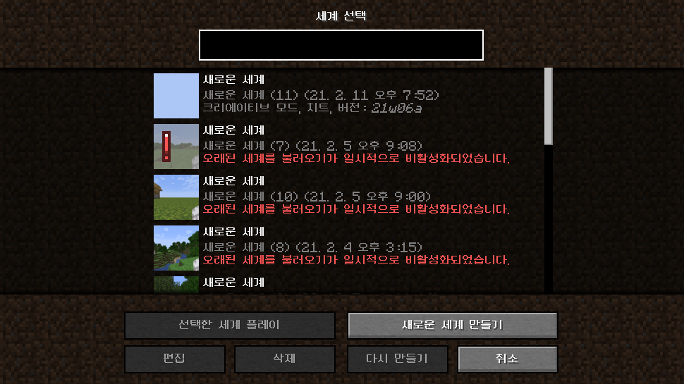 아직 동굴 업데이트의 개발 초기 단계이므로 21w06a 이전 버전에 만들었거나 플레이했던 세계를 플레이할 수 없습니다.