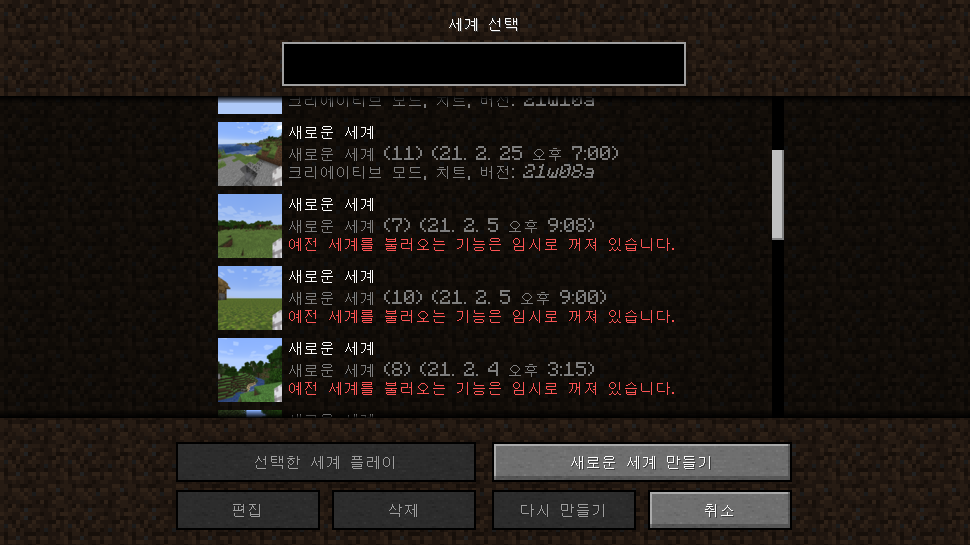 - 아직 동굴 업데이트의 개발 초기 단계이므로 21w06a 이전 버전에 만들었거나 플레이했던 세계를 플레이할 수 없습니다.
