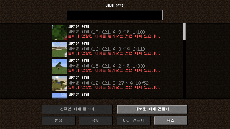 - 21w15a부터 일부 동굴 관련과 높이 제한 업데이트가 임시로 꺼진 상태이기 때문에 21w06a~14a 사이에 만든 세계는 플레이할 수 없습니다.
