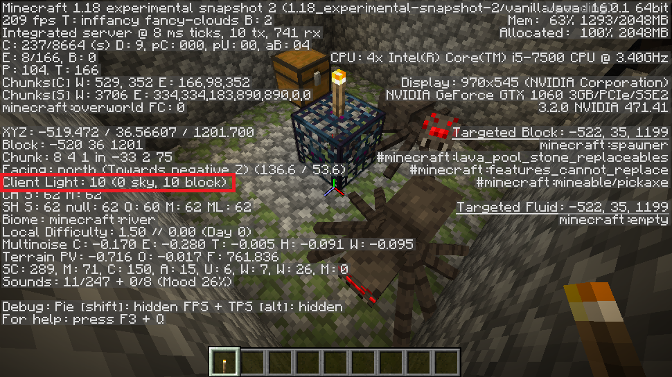 좀비, 스켈레톤, 거미, 동굴 거미 생성기는 이제 최대 블록 조명 레벨 11까지 몹을 생성합니다.