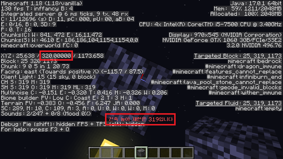 세계 생성 범위와 건축 제한 높이가 아래로 64블록(-64), 위로 64블록(320)씩 확장됨으로써, 총 384 높이로 확장되었습니다.