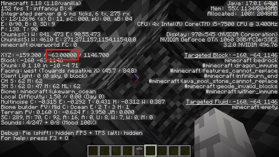 오래된 청크에서 높이 0에 기반암 층이 있으면 공기가 아닌 블록 아래에 새로운 지형으로 채워지며, 0~4 사이의 높이에 있는 기존 기반암 층은 심층암 층으로 대체됩니다. 그렇게 새로운 기반암 층은 -64 높이에 배치됩니다.