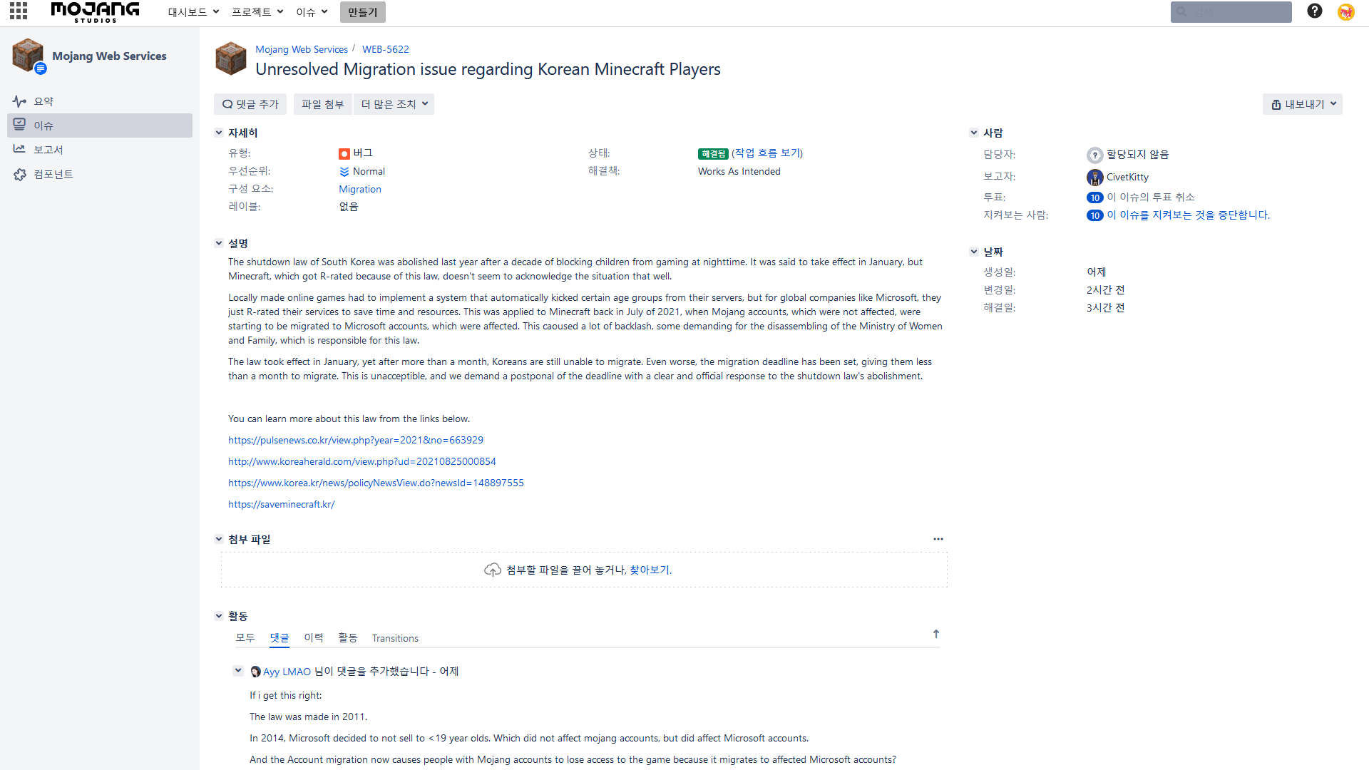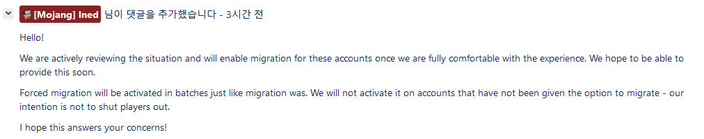 해당 버그 트래커, 모지라(모장 버그 트래커) 레딧, 트위터를 통해 공론화를 펼친 사향(CivetKitty)은 "지난 10년간 청소년의 야간의 게임 이용을 금지하는 한국의 셧다운제는 올해 폐지됐으나, 이 제도로 인해 R등급(소위 18세 이상, 정확히는 이건 영화 관람 등급)을 취급받은 마인크래프트는 상황을 잘 인식하지 못하는 것 같다. 셧다운제 폐지는 지난 1월에 시행됐지만 한 달이 넘도록 한국인들은 여전히 계정 이동을 못하고 있다"며 목소리를 전했습니다. 많은 한국인 마인크래프트 사용자들이 계정 이동 강제에 대한 불안감이 커지고 있는 가운데, 버그 트래커에서 Ined가 해당 내용에 대한 답장을 남겼습니다.