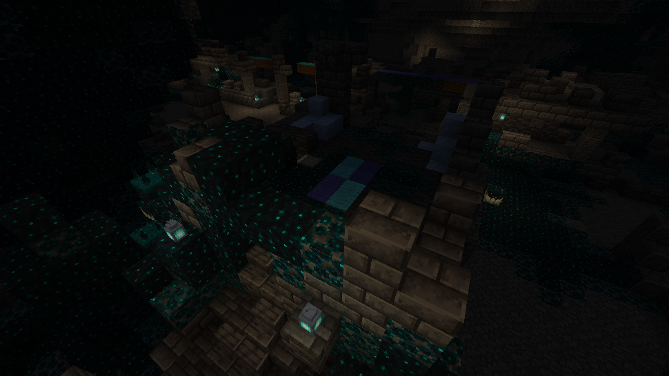 깊은 어둠의 고대 도시이기 때문에 워든을 제외한 몹은 자연 생성되지 않고, 곳곳에 여러 개 있는 노획물 상자 주변에 대부분 스컬크 비명체를 포함한 스컬크 유형 블록들로 도배되어 있기 때문에 조심해야합니다.