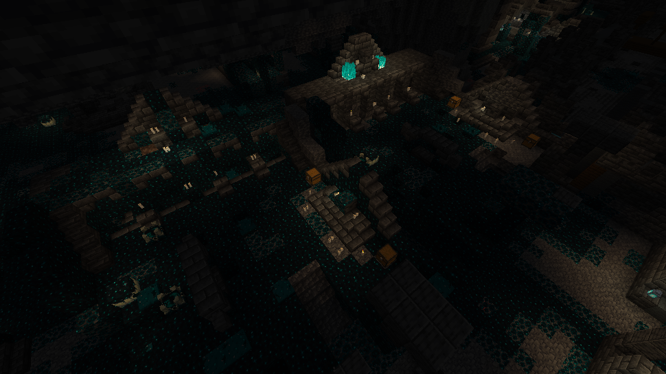 깊은 어둠의 고대 도시이기 때문에 워든을 제외한 몹은 자연 생성되지 않고, 곳곳에 여러 개 있는 노획물 상자 주변에 대부분 스컬크 비명체를 포함한 스컬크 유형 블록들로 도배되어 있기 때문에 조심해야합니다.