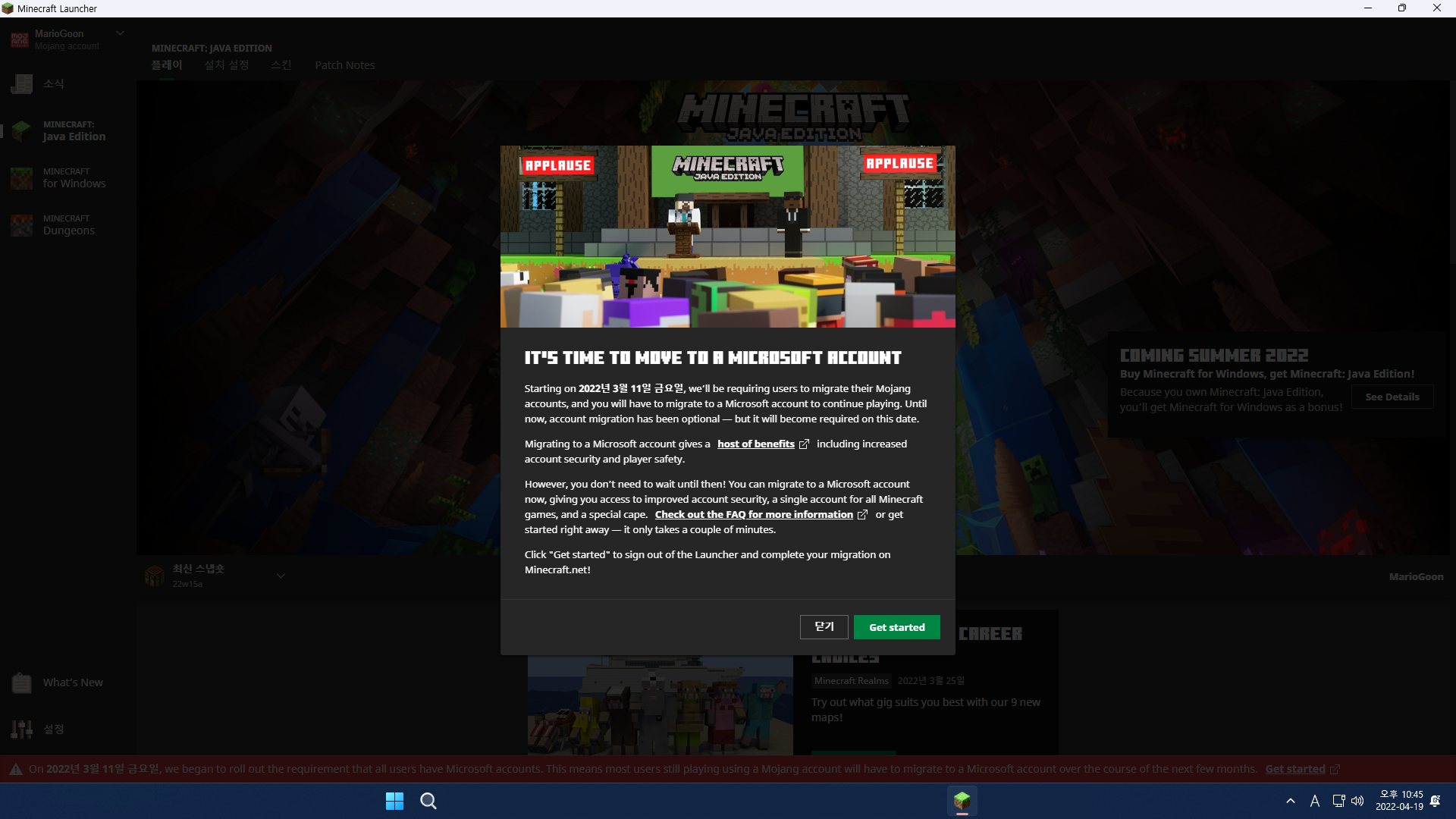 한국 마인크래프트(모장) 계정을 마이크로소프트 계정으로 이전 가능