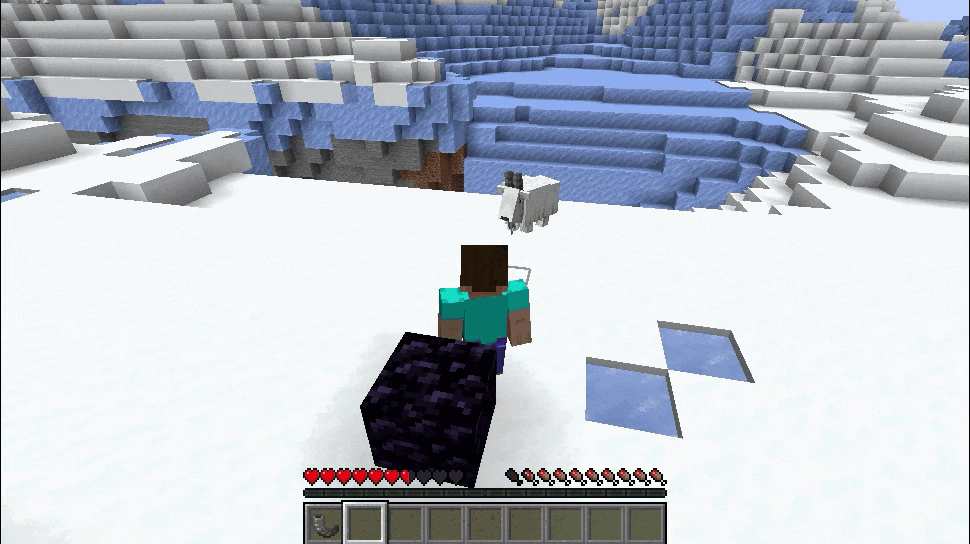 이제 플레이어나 갑옷 거치대를 향해 돌진할 때 원목이나 나무 혹은 기타 단단한 블록(돌, 단단한 얼음, 철 광석, 구리 광석, 에메랄드 광석)에 박으면 염소 뿔을 떨어뜨립니다.