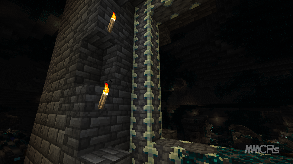 사람이 다녀간 흔적을 찾을 수 있지만 몹은 전혀 생성되지 않고, 스컬크 투성이에 노획물 상자 주변에 여러 개의 스컬크 비명체가 있기 때문에 워든이 나오지 않도록 주의해야 합니다.