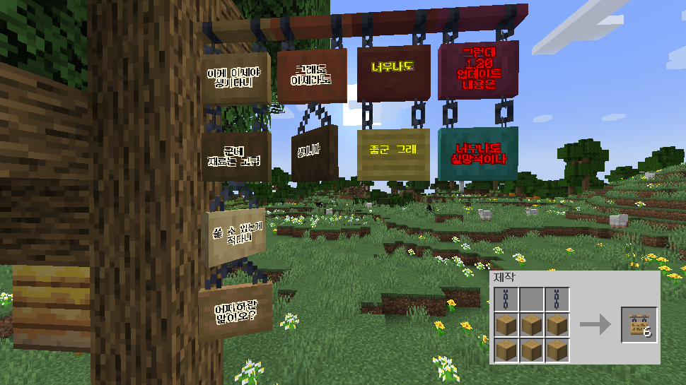 왼쪽 오른쪽 상단 사슬 2개, 아래에 껍질 벗긴 원목 6개로 걸이 표지판 6개를 만들 수 있으며, 지지할 수 있는 블록 밑면 혹은 측면은 물론, 걸이 표지판 밑에도 놓을 수 있습니다.