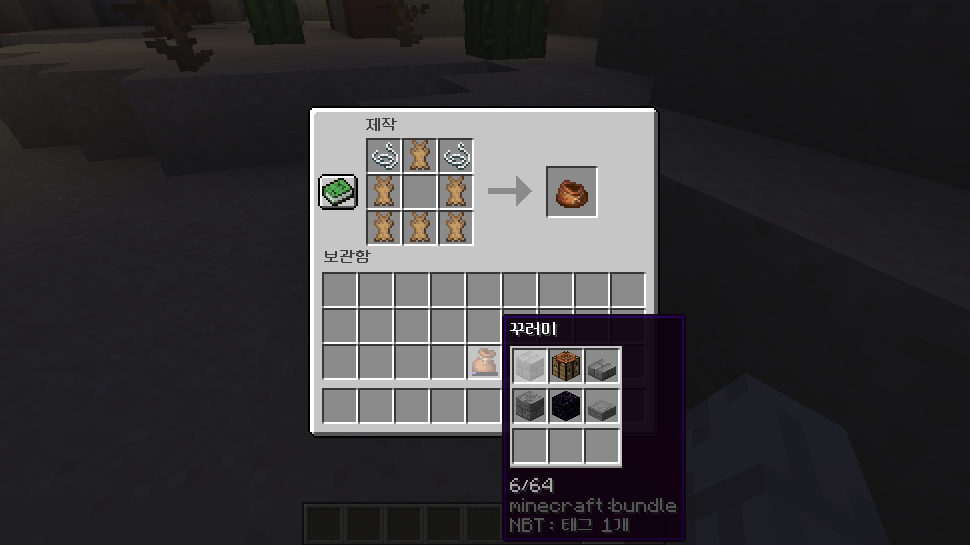 사실 원래 전부터(1.17 스냅샷 20w45a~) 있었던 아이템이었고 현재 버전까지도 데이터 팩을 사용하지 않아도 /give 명령어로만 꺼낼 수 있었지만 게임내에 추가된 bundle 데이터 팩을 적용함으로써 크리에이티브는 물론, 제작법이 다시 추가(왼쪽, 오른쪽 상단 실 2개, 가운데 제외한 나머지 토끼 가죽 6개)되어 서바이벌에서도 얻을 수 있게 되었습니다.