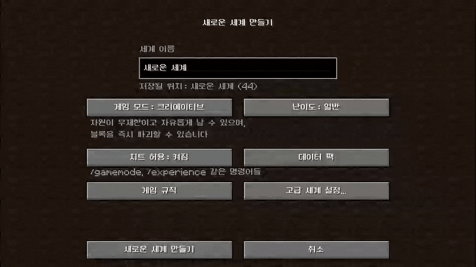 진행을 누르고완료를 눌러 데이터 팩에서 빠져나갑니다. 새로운 세계 만들기를 누르면 다른 경고 문구가 한 번 더 표시되는데예를 눌러 세계를 만들면 됩니다.