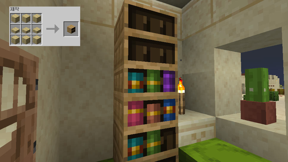책, 책과 깃펜, 쓰여진 책, 마법이 부여된 책을 포함하여 1블록 당 최대 6권까지 수납 가능합니다.