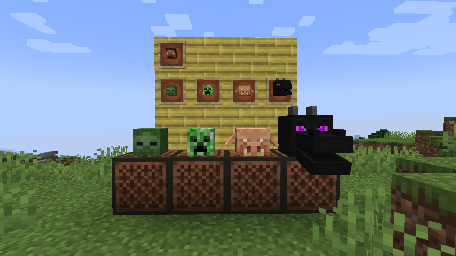 이제 몹 머리를 위에 놓고 때리거나 레드스톤으로 작동하면 각 몹에 대한 소리들 중 무작위로 하나가 재생됩니다.