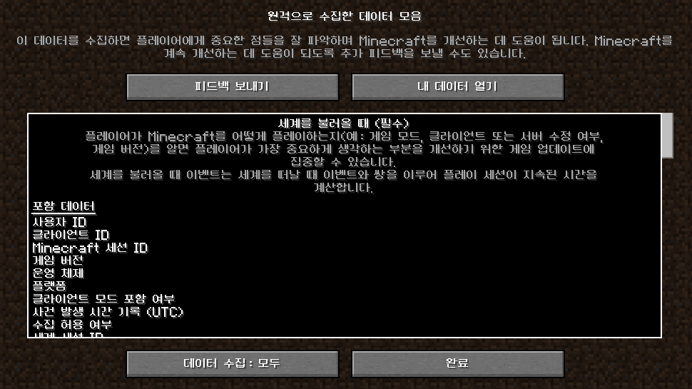개발사가 수집하는 모든 데이터는 필수 혹은 옵트인 여부에 관계없이 GDPR(General Data Protection Regulation, 개인정보보호 규정) 및 CCPA(California Consumer Privacy Act, 캘리포니아 소비자 프라이버시법)의 모범적 사례에 따라 처리되며, 이는 마인크래프트를 개선하는 것에 크게 도움이 됩니다.