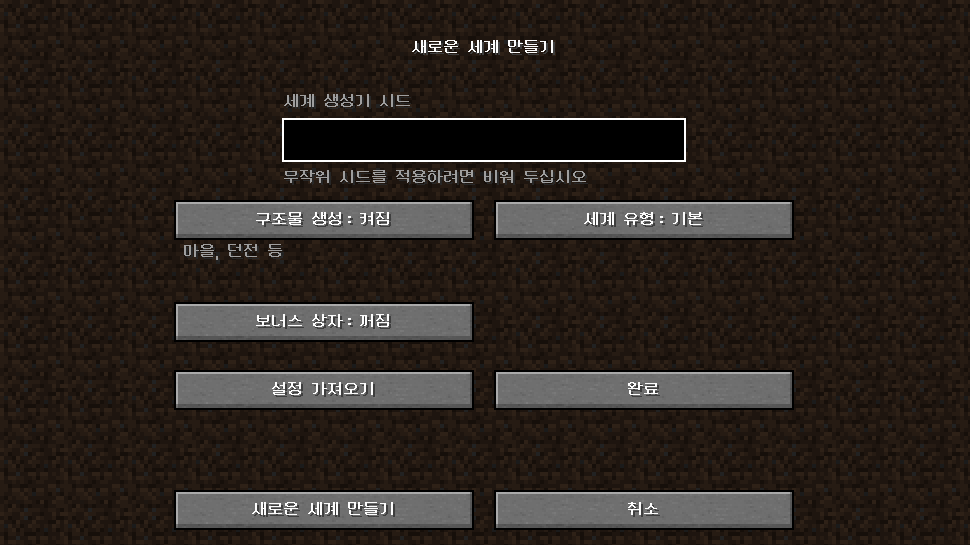 새로운 세계 만들기시드 텍스트 공간 화면에무작위 시드를 적용하려면 비워 두십시오레이블이 있음에도 불구하고 무작위 시드가 이미 생성되어 있음. - MC-257188 - 사망 화면에서