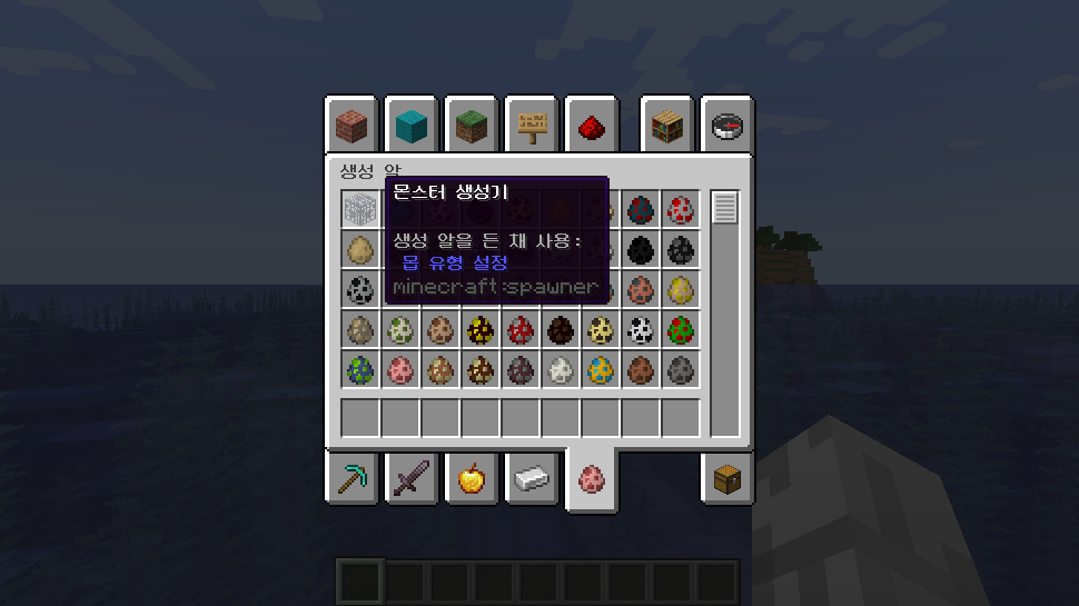 블록 선택 키를 통해서도 얻을 수 있으며, 도구 설명을 통해 해당 몬스터 생성기에 대한 몹 유형을 볼 수 있습니다. 이때, 몹 유형이 아직 정의되지 않았다면 몹 유형 설정 방법이 대신 표시됩니다.