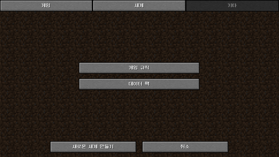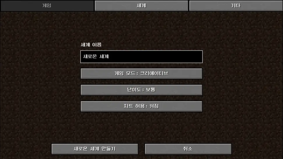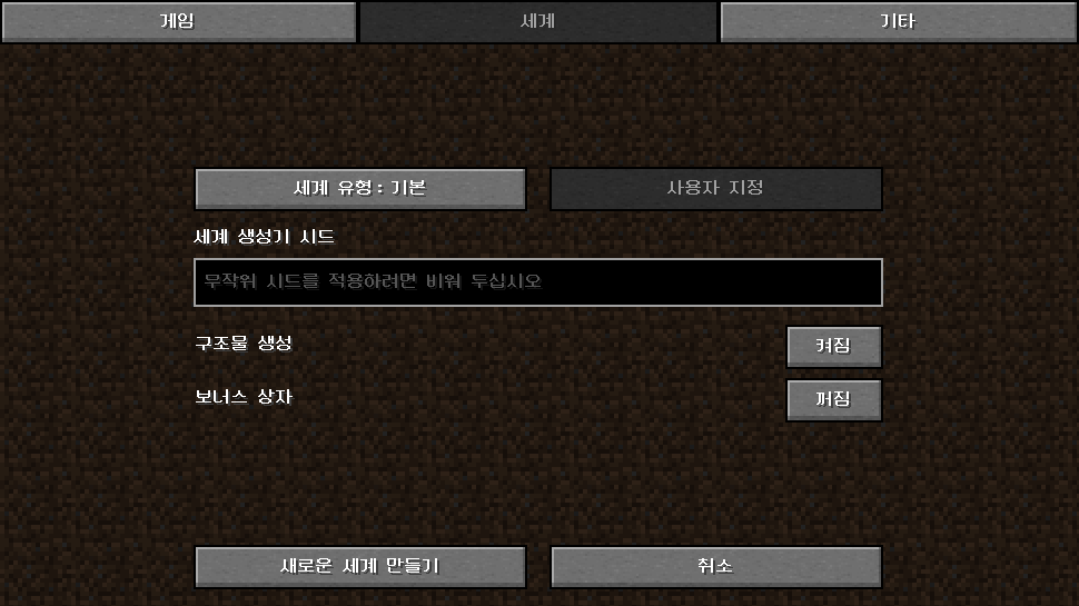 게임(Game) - 세계 이름, 게임 모드, 난이도, 치트 허용 여부 설정세계(World) - 세계 유형, 사용자 지정, 시드, 구조물 생성 여부, 보너스 상자 생성 여부 설정기타(More...) - 게임 규칙, 데이터 팩 설정