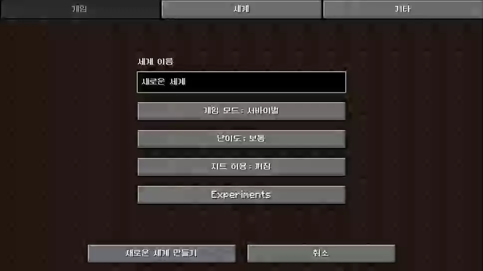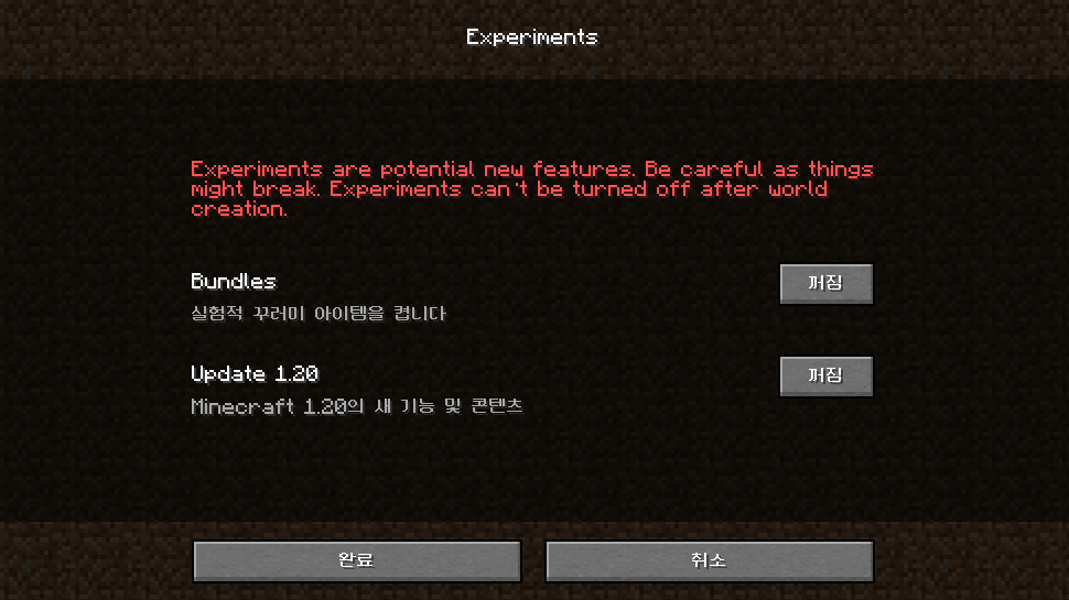 Experiments(실험) 버튼을 누릅니다. Update 1.20(꾸러미 실험적 기능 사용시Bundles도 함께) 오른쪽에 있는꺼짐을켜짐으로 바꾼 후완료를 누릅니다.새로운 세계 만들기를 누릅니다.
