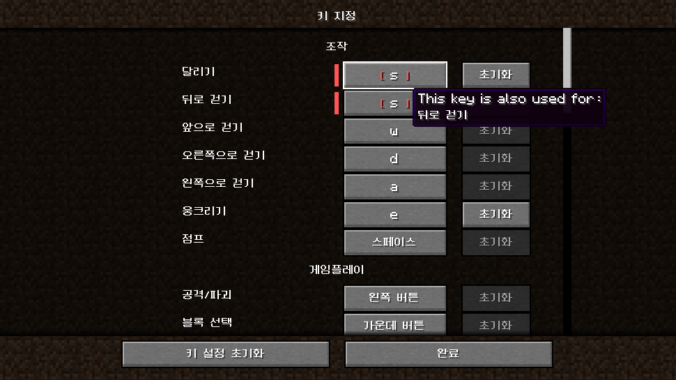 키 지정 설정은 이제 충돌하는 설정이 있으면 해당 버튼에 마우스를 갖다대면 도구설명이 표시됩니다.