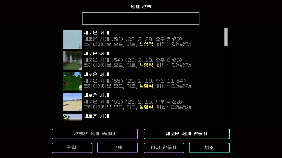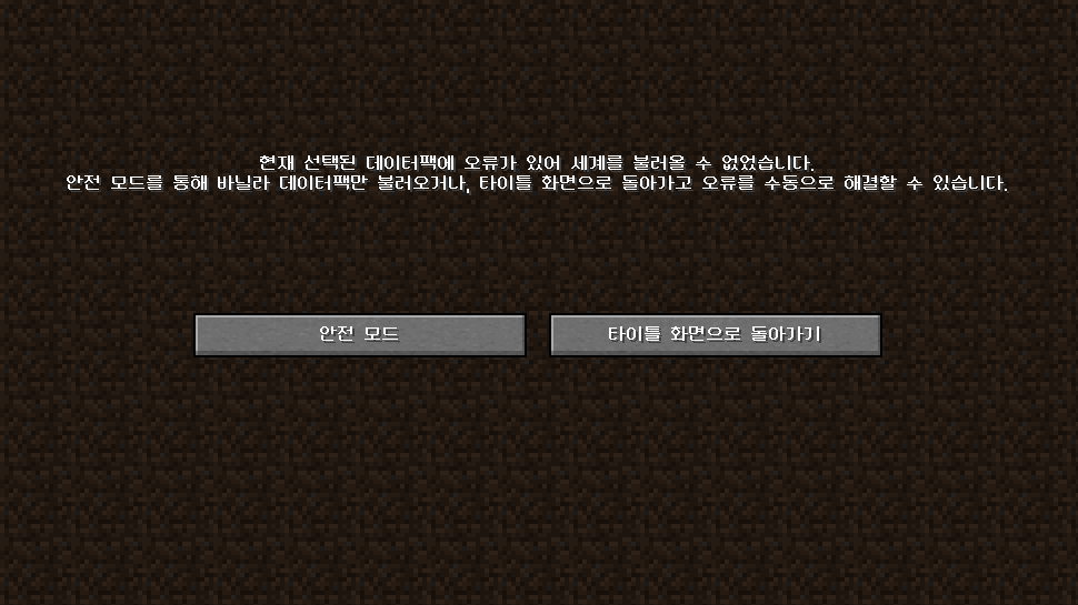 - 1.19.4 프리릴리스 1 이전 버전(~23w07a)에서 실험적 기능(데이터 팩) 적용 후 만든 세계는 1.19.4 프리릴리스 1 이후부터 불러올 수 없습니다.