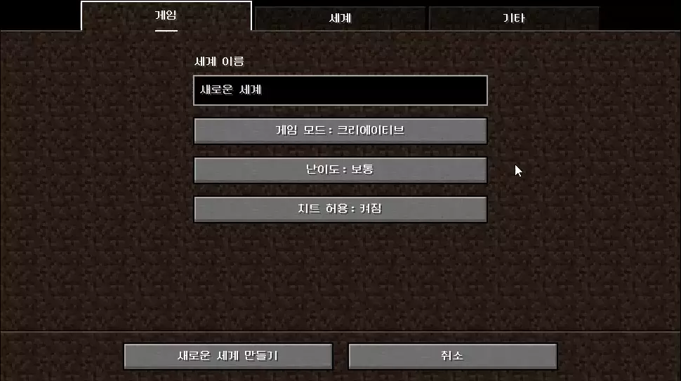 게임- 세계 이름, 게임 모드, 난이도, 치트 허용 여부 설정세계- 세계 유형, 사용자 지정, 시드, 구조물 생성 여부, 보너스 상자 생성 여부 설정기타- 게임 규칙, 데이터 팩, 실험적 기능 사용 여부 설정